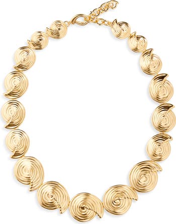 Graduated spiral charms take inspiration from the sea on this statement-making necklace plated in 18-karat gold.