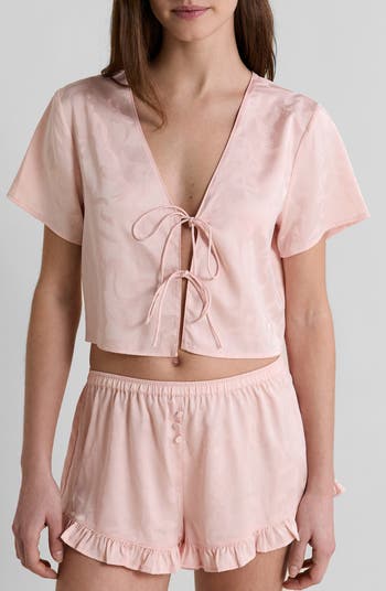 Front ties bring a trendy look to your bedtime routine when you don this pajama top made from soft satin with a tonal print.