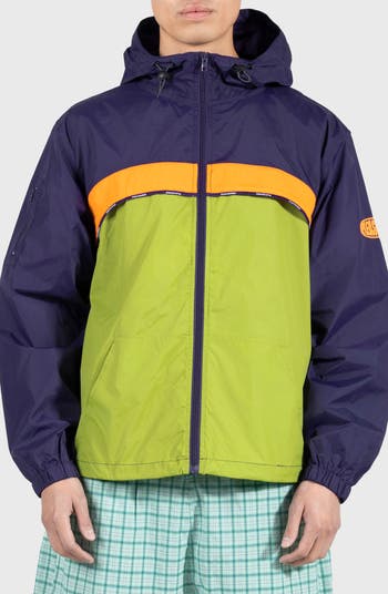 Blocks of color add a bright color-pop element to a hooded windbreaker fashioned from sleek nylon.