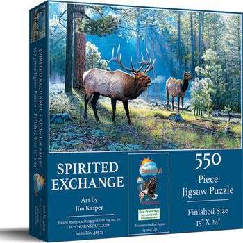Spirited Exchange 550 Piece Jigsaw Puzzle - 550 pc Jigsaw Puzzle - Completed Size: 15" x 24" - Puzzle Artist: Jim Kasper - Interlocking Pieces and Durable Construction: SunsOut jigsaw puzzles feature interlocking pieces that fit securely, making assembly easier and reducing frustration. Made with high-quality recycled cardboard, they are durable and to easy to work with - Warranty: SunsOut puzzles being made in the USA ensures high manufacturing standards include a worry-free guarantee ensuring any issues with missing or damaged pieces are resolved, reflecting SunsOut's commitment to quality and customer service. - Eco-Friendly Materials: SunsOut puzzles are crafted with eco-friendly materials
