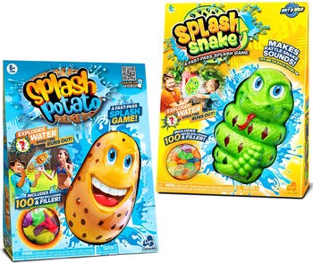 SPLASH BUNDLE: POTATO & SNAKE - Get ready for a hilarious twist on the classic game of hot potato—with a soaking surprise! The Splash Potato & Splash Snake bring fast-paced, splash-filled excitement that’s perfect for family gatherings, outdoor parties, and hot summer days. These fun and unpredictable water games keep everyone laughing, guessing, and dodging the next big splash! Just fill a balloon with water, place it inside the Splash Potato or Splash Snake, set the timer, and start tossing! The goal is simple—don’t get caught when the timer runs out! When it does, the balloon bursts, soaking whoever’s holding it. The suspense builds with every pass, making each round an exciting test of reflexes, luck, and laughter. These games are designed to be easy, safe, and endlessly entertaining, encouraging active play and teamwork among kids and adults alike. Perfect for outdoor fun, the durable designs are built to handle energetic play and multiple splash sessions. SPLASH POTATO & SPLASH SNAKE! The Fun Splash & Pass Game! Just fill your water balloon, place inside and close, set the timer, and pass it before it explodes! Unlimited outdoor water fun. Set INCLUDES 1 Splash Potato, 1 Splash Snake, 2 balloon fillers, and 200 balloons in total. Easy to use and no batteries required! Ages 6 and up.