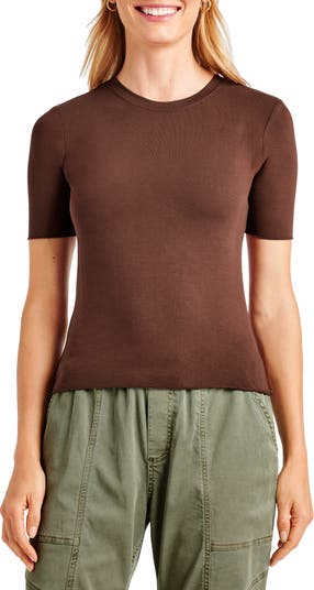 Elongated short sleeves bring an on-trend look to a stretchy and trim T-shirt you'll want in every color.