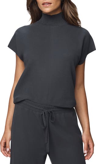 Abbreviated dolman sleeves frame this soft, stretchy knit sweatshirt topped with a ribbed mock neck.