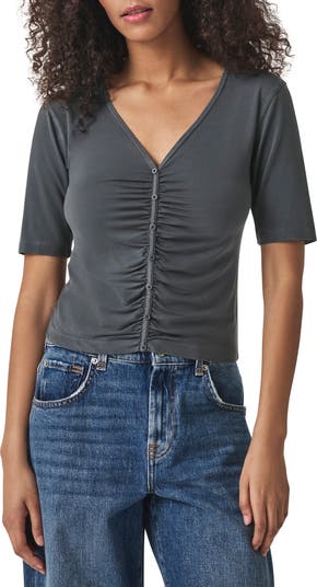 Decorative buttons enhanced with flattering ruching creates a draped effect of this lightweight T-shirt made from a stretchy fabric with a soft, lightweight feel.