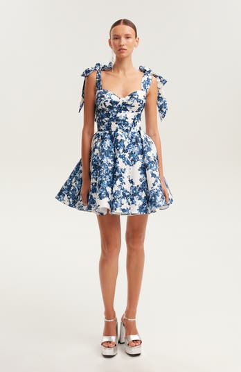 This floral satin mini dress features a fitted heart-shaped corset bodice and an A-line mini skirt. Designed with wide bow straps that can be tied for an adjustable fit, the dress offers both support and styling versatility. The lace-up back closure provides a customizable fit, while a cinched waist is defined with a signature silver belt detail. Available in blue hydrangea and pink peony floral prints. Designed for cocktail parties, garden parties, wedding guest outfits, summer events, and special occasions.