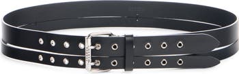 Shiny grommets punctuate an Italian-crafted belt fashioned from smooth leather in an unexpectedly split silhouette.