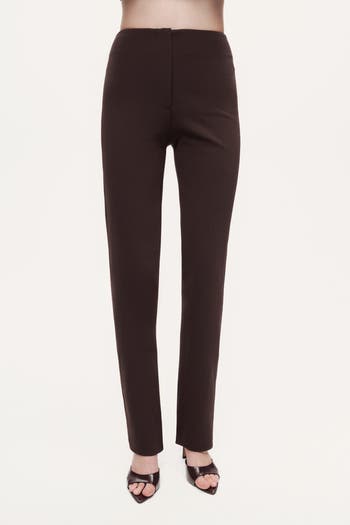 Refined and versatile, these slim straight-fit trousers are tailored from smooth woven fabric with a mid-rise waist and clean, pocket-free front. The concealed zip-and-hook fastening ensures a polished look, while the subtle split hems at the outer seams add a modern, elongating effect. Unlined for a lightweight feel, they’re the perfect foundation for both minimalist and statement tops.