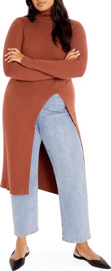 A longline silhouette gives layerable versatility to this curve-hugging sweater that's bookended by a turtleneck and a soaring slit along the hem.