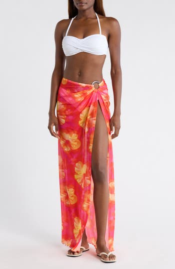 Make your way from point A to beach and back in this stretchy maxi skirt cover-up made from bright and sheer floral-print mesh.