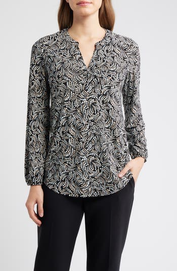 This versatile top features an eye-catching print on the flowy silhouette framed by long sleeves.