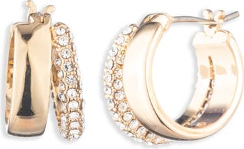 A split hoop design doubles your shine in these golden earrings that catch light with crystal pavé.