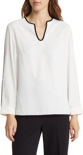 A contrast trim traces the split neck and sleeves of the lightweight blouse cut from smooth crêpe de Chine.