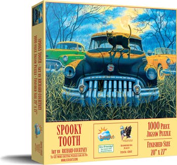 Immerse yourself in a hauntingly intriguing realm filled with Richard Courtney's eerily enchanting artistry with the Spooky Tooth 1000 Piece Jigsaw Puzzle. Crafting each piece with renowned SunsOut Puzzles' unmatched quality and deliberate die-cut precision, your puzzle assembling transforms from a mere pastime into a journey into an atmospheric world of mystery. As you interlock each piece of this 20" x 27" puzzle, engagingly designed for adults, you are promised a satisfying, frustration-free experience, maximizing joy drawn from high-quality, recycled cardboard that is sturdy and seamless, affirming SunsOut's commitment to superior quality and outstanding customer service, backed by a worry-free guarantee. Delight in a guilt-free experience buoyed by SunsOut's use of eco-friendly, soy-based inks and recycled boards that showcase not just the vibrancy of Richard Courtney's licensed artwork, but also a commitment to sustainability. As a woman-owned business, every piece of the Spooky Tooth puzzle that you connect signifies your support for a passionately built legacy of creativity, quality, and dedication. This puzzle offers you more than an entertaining way to spend your free time; it also stands as a testament to high-quality, sustainable entertainment, making it an ideal conversation starter and a bonding activity. Embark on this enchanting challenge and let SunsOut transform your ordinary moments into extraordinary experiences through the journey of assembling the Spooky Tooth puzzle – a perfect blend of suspense and creativity that invites you to dive into the captivating world hidden within its pieces.