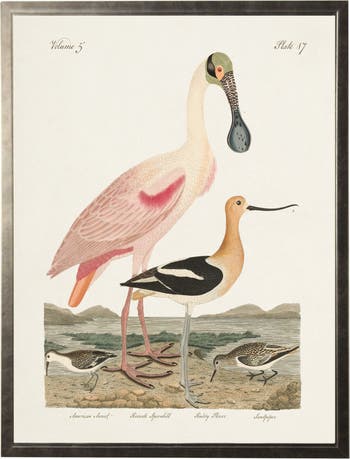 This vintage-inspired print, framed in a silver wooden frame, features three spoonbill birds by an ocean shore. Sized at 18 inches by 24 inches, this made in the USA frame makes for a beautiful addition to any wall.