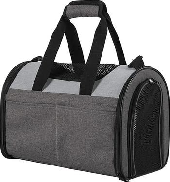 SPORT AIRLINE PET CARRIER: 16" - SMOKE GREY - Make traveling with your furry friend easier with the JesPet Soft-Sided Sport Pet Carrier. Designed to hold its shape without collapsing, this carrier features sturdy construction with a nylon exterior that is lightweight, waterproof and easy to clean. The top and sides are made of hard EVA material with mesh openings for ventilation. This carrier contains a fleece mat for your paw-tner to rest on and make him feel more comfortable while inside. It also includes three big pockets on the side and folds down for storage. Keep your companion safe and sound no matter where you go with the JesPet Soft-Sided Sport Pet Carrier. OVERVIEW: Measures 16x10x11 inches. For small pets up to 10lbs. Durable waterproof fabric, scratchprrof mesh, safety inner leash, padded shoulder strap, removable washable mat, foldable, airline approved.