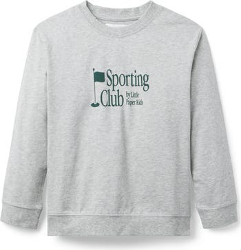 Kids' lightweight sweatshirt in heather gray features a sporting club logo in hunter green on the front. Designed for both boys and girls and crafted from soft, breathable cotton. Provides comfort without bulk and is ideal for layering or wearing on its own.