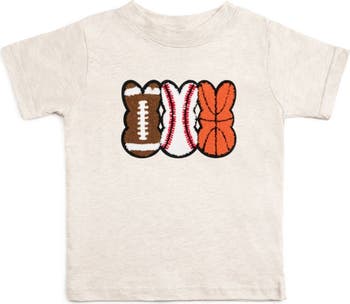 Score big this Easter with this cozy, heathered tee that features a fun trio of football, baseball, and basketball patches, perfect for your little athlete.