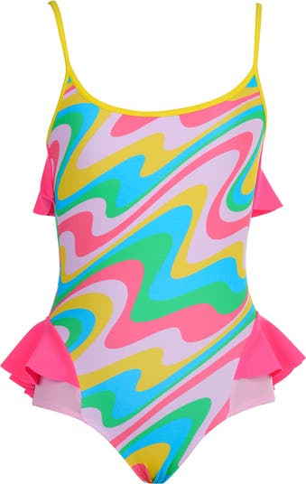 Sporty Multi-Color Neon Orbit Side Ruffles One-Piece Swimsuit