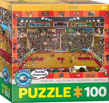 EUROGRAPHICS SPOT & FIND BASKETBALL 100 PIECE JIGSAW PUZZLE ACTIVITY, 13" X 19" ASSEMBLED SIZE, INTERACTIVE GAME, HIGH-QUALITY RECYCLED MATERIALS. Experience the excitement of the basketball game with EuroGraphics' "Spot & Find Basketball" 100-Piece Puzzle. This innovative puzzle, with a box size of 8" x 8" x 2.37" and a finished size of 13" x 19", combines the thrill of a jigsaw puzzle with the challenge of a spot & find game. Kids will enjoy searching for hidden items within the vibrant basketball scene, adding an extra layer of fun to the puzzle-solving experience. Crafted with durable pieces from premium, 100% recycled European blue board and printed with non-toxic vegetable-based ink, this puzzle ensures both safety and entertainment for your child. The packaging includes informative details in English, French, Spanish, and German, providing an opportunity for language learning alongside the excitement of the game. EuroGraphics' commitment to superior quality guarantees a delightful and educational experience for young sports enthusiasts. Get ready for hours of fun and discovery with EuroGraphics' "Spot & Find Basketball" puzzle.