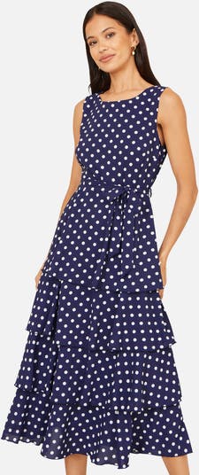This polka-dot dress brings playful elegance to any occasion. Designed with a classic sleeveless bodice and a flattering tie-waist, it effortlessly enhances your silhouette. The tiered ruffle skirt adds beautiful movement and charm, making this dress perfect for daytime events, dinners, or summer celebrations.