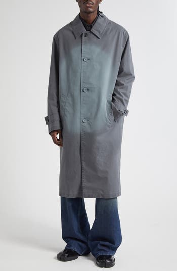 This roomy cotton coat is finished with an oval of grey-blue spray dye in front, while chipped enamel buttons within the oval further the weathered illusion. At the back, the Maison’s white stitch line offers a quiet signature.