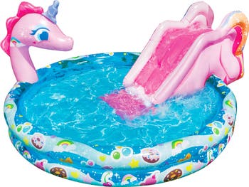 There's a Unicorn in your backyard! Go down the slide and splash into the sweetness of summer with the Spray N' Splash Unicorn pool! Little ones will love to splash and play with the magical unicorn and its water filled 5 ft diameter pool. It is constructed with durable PVC material for long lasting use!
