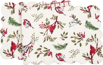 - This table runner showcases a charming woodland design with vivid red cardinals and soft chickadees resting on pine sprigs. The quilted stitching and scalloped edge add texture and elegance, making it a perfect centerpiece for your winter table décor.