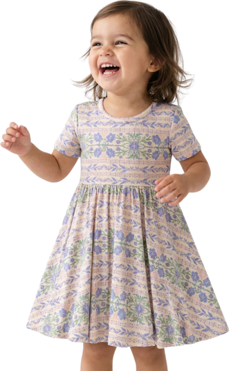Our short-sleeve girls twirl dress is made from our luxuriously soft fabric. Featuring a classic design and a spin-worthy skirt, it’s sure to be a favorite for your little one. Its tag-free design makes it ideal for even the most sensitive skin. Our kids pieces run on the small side - if your child is between sizes, we recommend sizing up.