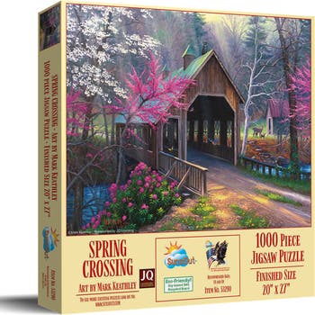 Spring Crossing 1000 pc Jigsaw Puzzle by SunsOut - 1000 Piece Jigsaw Puzzle - Completed Size: 20" x 27" - Puzzle Artist: Mark Keathley - Interlocking Pieces and Durable Construction: SunsOut jigsaw puzzles feature interlocking pieces that fit securely, making assembly easier and reducing frustration. -Ages: 15 years and older - Perfect for adults and seniors. SunsOut puzzles ensure high manufacturing standards ensuring their commitment to quality and customer service. - SunsOut puzzles use soy based inks, high quality puzzle board. As this is a jigsaw puzzle: assembly is required and batteries are not required.