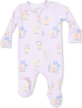 Happy ducklings pattern this supersoft gingham-print footie with convenient two-way zip closure and foldover cuffs.
