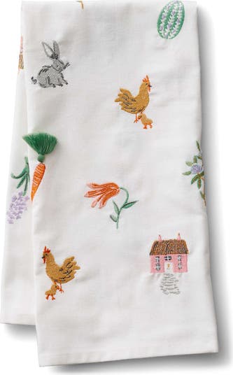 Made of absorbent cotton, this farm-inspired tea towl features intricately embroidered details and playfully placed tassels.