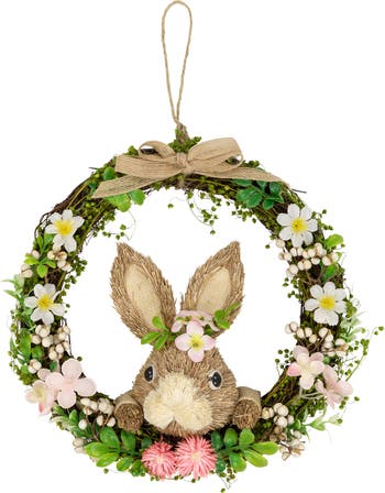 Celebrate the arrival of spring and the Easter season with this enchanting floral Easter wreath. Exquisitely crafted, it features a vibrant array of white and pink flowers, bringing a fresh burst of springtime sensations right to your door. Adding a charming touch is a cute peering rabbit, nestled perfectly at the center of the floral display, creating an adorable Easter theme. Product Features: Unlit Easter floral wreath with peering rabbit Decorated with flowers, globe thistles, berries and a jute bow Flowers come intertwined with seeds and green foliage Rabbit is accented with burlap sleeves and ears; adorned with pink and white flowers No assembly required – wreath comes in 1 piece Ideal for decorating your front door, mantel or walls Gravepine and twig backing Includes a jute cord loop for hanging Recommended for indoor use - if using outdoors place under a covered area Dimensions: 11” diameter (measured from outermost tip/edge to outermost tip/edge across the wreath) Material(s): plastic/foam/polyester/twigs