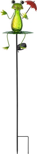 Add a touch of fun and inviting ambiance to your space with this set of decorative solar frog yard stakes and solar hummingbird yard stakes. This colorful and lifelike set of yard stakes is inspired by a cute frog and a fluttering hummingbird. They are sure to brighten up your outdoor garden, patio, yard, lawn, flowerbed, or home vase.