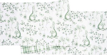 - This 100% cotton table runner features a charming green and white toile-style print with bunnies among botanical florals on one side, with a coordinating green plaid reverse that adds a fresh and beautifully versatile alternative styling look.