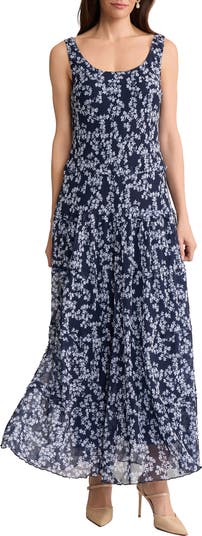 Enchanting allover blooms romance this floaty chiffon maxi accented with fluttering frills.