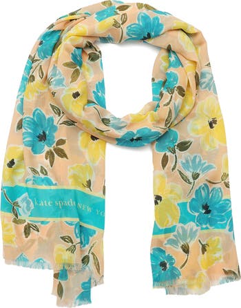 Vibrant spring blooms wash over this oblong cotton-and-silk-blend scarf designed with a light, fluid hand and unfinished fringe edges.