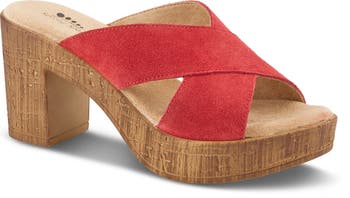 Crisscrossing vamp straps and a supple suede upper lend trend-savvy appeal to a lofty sandal set on a chunky platform and block heel.