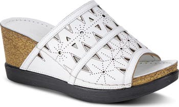 Geometric perforations create visual intrigue on a stylish leather sandal grounded by a cushioned footbed and cork-covered wedge heel.