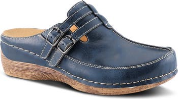 A woodgrain heel and bold stitching add a touch of boho-inspired style to this classic clog set on a cushioned footbed and flexible sole.