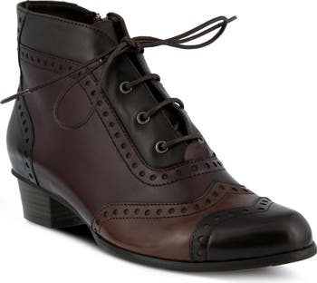 Brogue details and lace-up styling bring a Victorian air to a short bootie updated with color blocking and a convenient side zip.