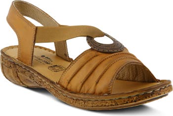 An antique-finish metal ornament brings vintage-inspired charm to this leather slingback sandal with comfy elastic straps and a slight wedge heel.