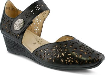 Your warm-weather wardrobe will blossom with this daisy-cut pump featuring vintage hardware on the strap and a braid-textured wedge heel.