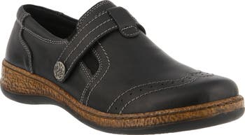 This clog-style loafer provides both elegant style and everyday comfort with a pretty strap button, topstitched detail and cushioned, supportive design.