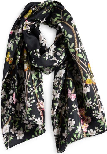 Butterflies flutter across a picturesque floral landscape on a luxe silk scarf that will underscore the whimsical charm of your poised looks.