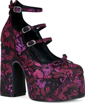 Bold floral patterns pop on this lofty platform pump complete with slim buckle straps.