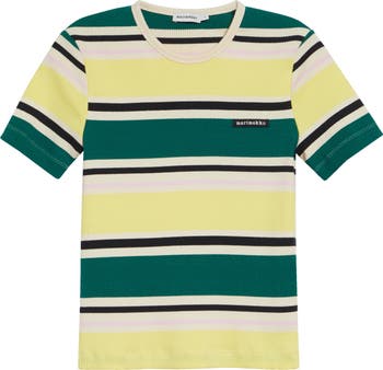 Blocky stripes pattern this stretchy cotton-blend T-shirt made of a supersoft rib.