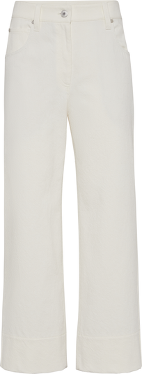 Dyed cotton and wool wrinkled denim is a casual looking fabric, characterized by a slight crumpled effect.
