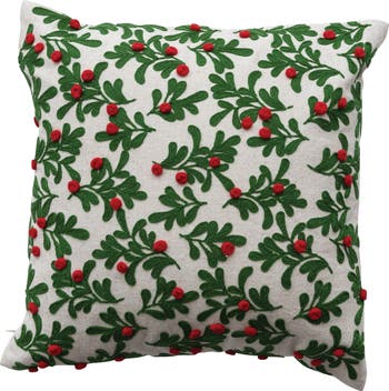 - A charming square pillow featuring an embroidered mistletoe pattern and playful pom poms in natural, green, and red