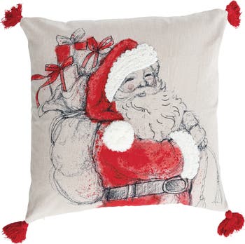 Square Cotton Chambray Printed Pillow with Embroidered Santa Image, Tufting, Pom Poms and Tassels, Multicolor