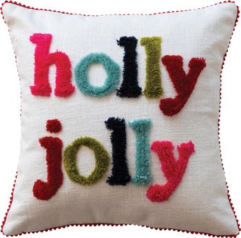 - A festive 'Holly Jolly' inscription, complete with playful tufting and pom pom trim, adorns this vibrant multicolored cotton slub pillow